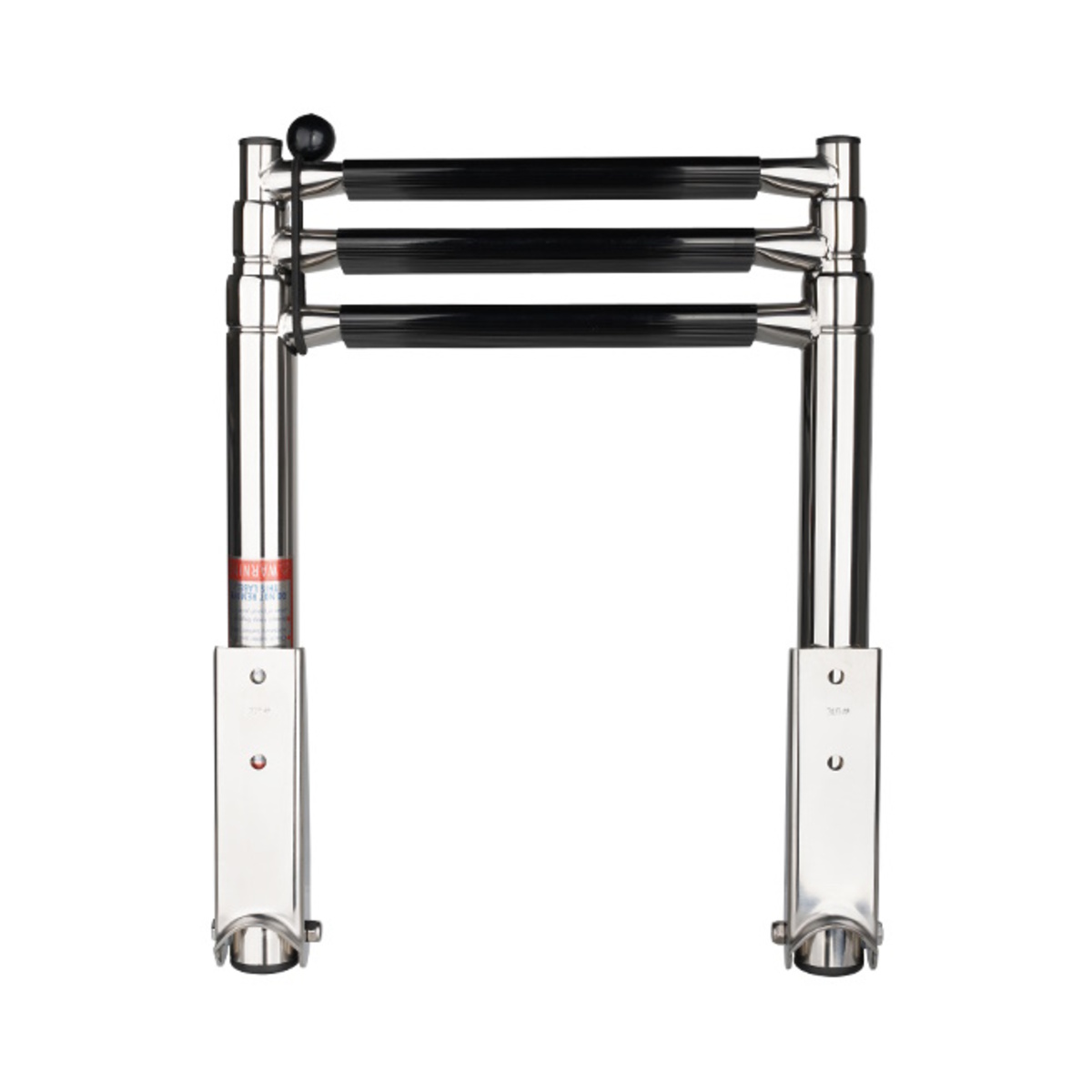 Marine grade polished stainless steel for superior corrosion resistance and durability. Ladder telescopes down and easily folds over platform. Each step has a flat tread cover w/ non-slip plastic for added safety.