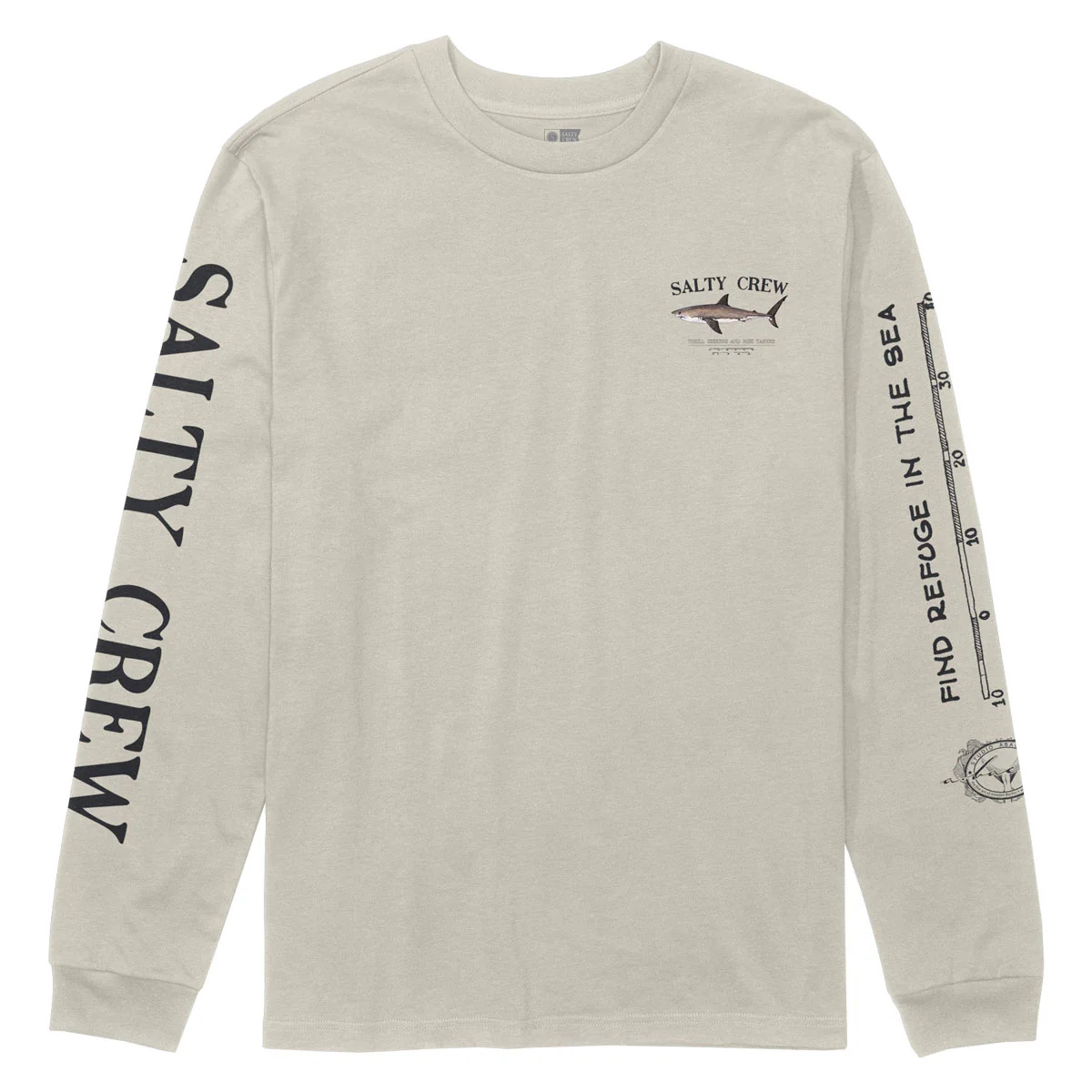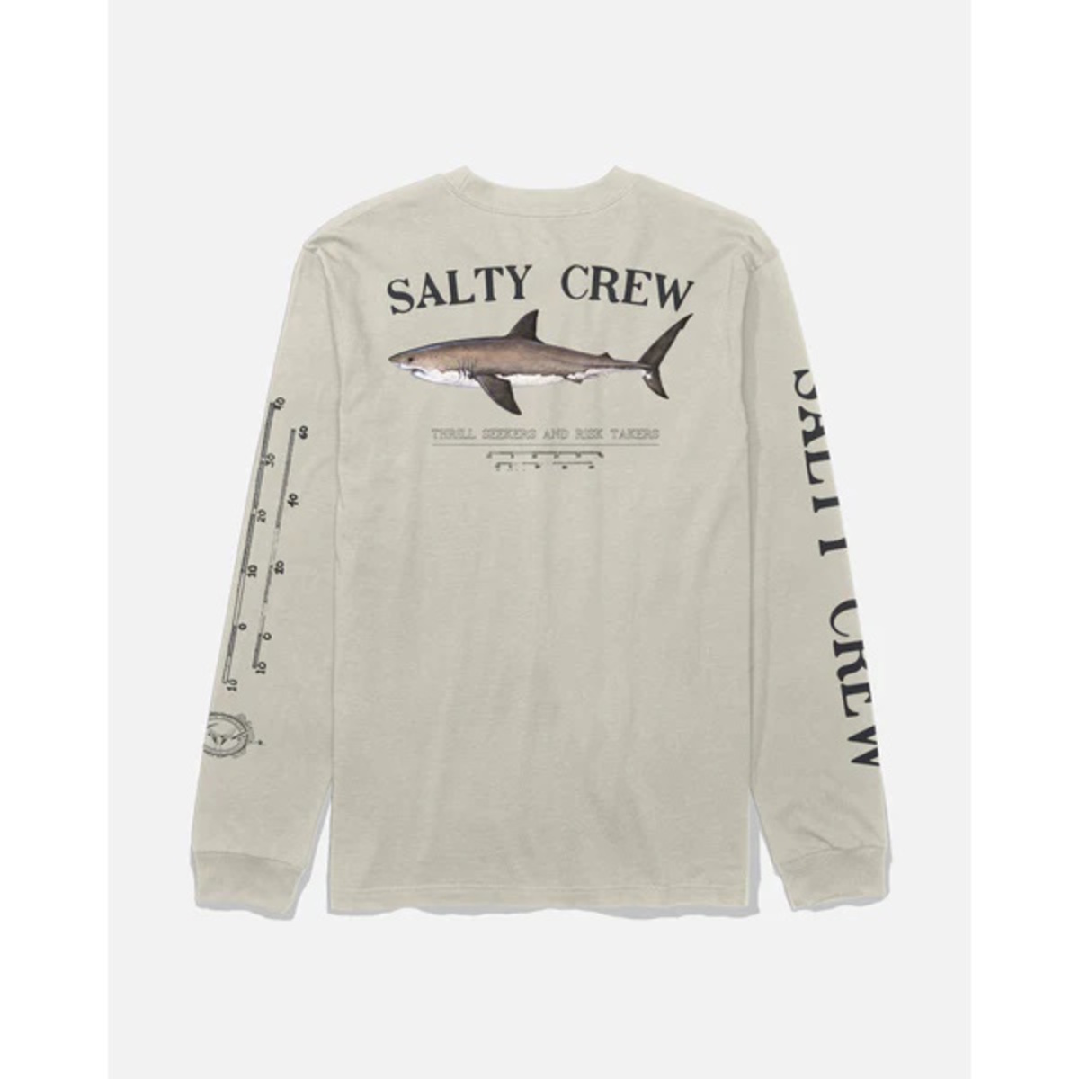 The Bruce Boys Long Sleeve Tee in Bone is made from 100% Cotton Jersey. It features a rib-knit neckband and cuffs, digitally printed front and back graphics, and a Salty Crew clamp label at the body hem.