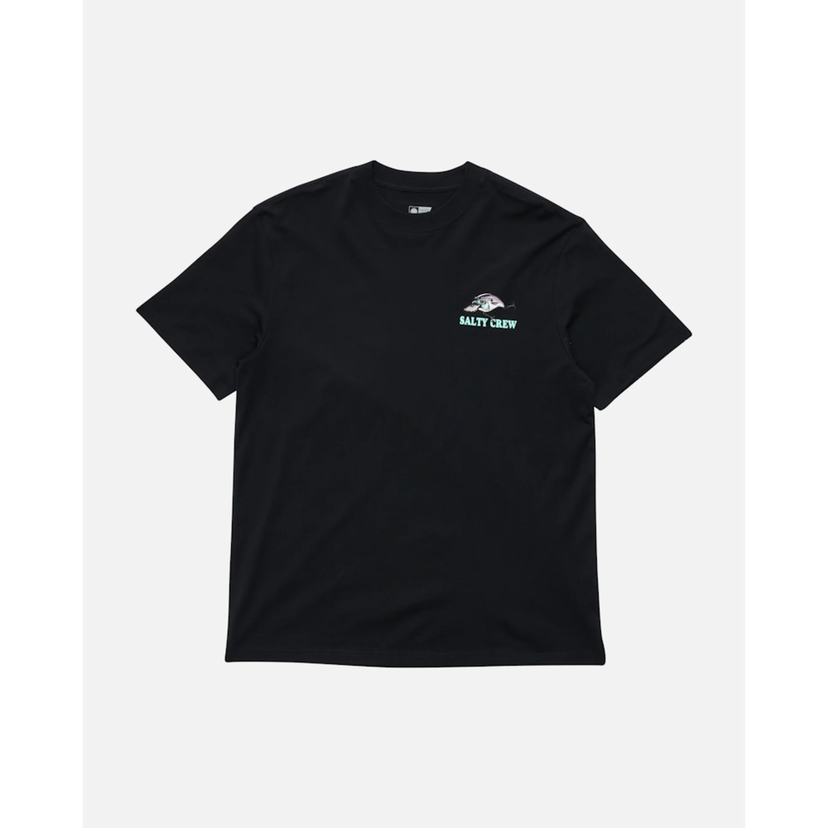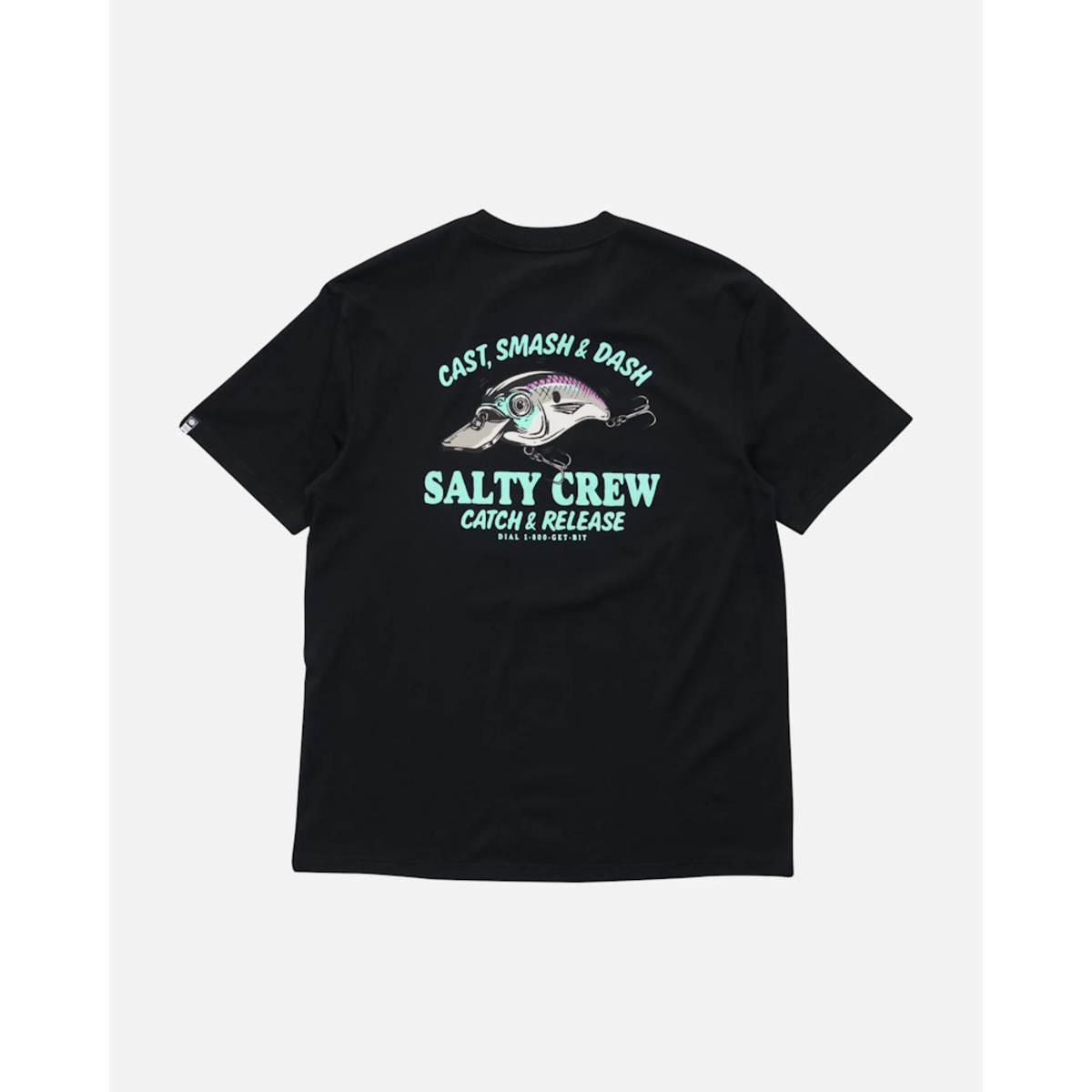 The Cast Life Classic SS Tee in Black is made from 180gsm soft-spun Cotton Jersey. It features screen printed graphics on the front and back, with a Salty Crew clamp label at the sleeve hem.
