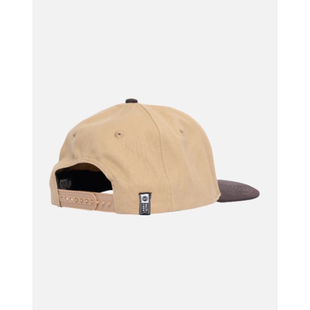 Salty Crew Buckle Structured 6-Panel Cap in Khaki is made from 100% cotton twill. It features a woven patch with a merrowed edge at the front and a snapback closure at the back.