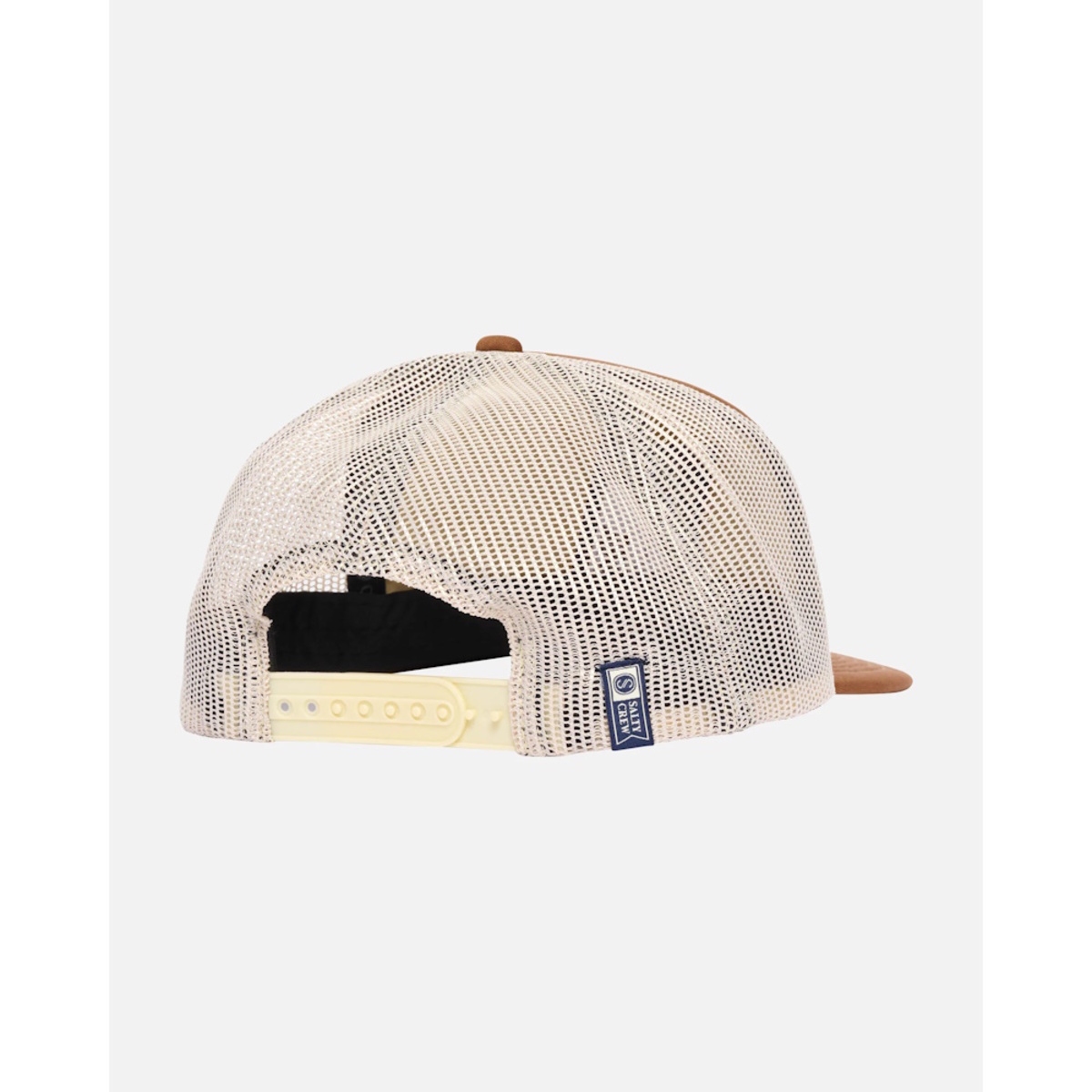 The Cast Life 5-Panel Trucker Cap in Friar Brown is an unstructured, mid-crown trucker made from 100% polyester interlock with foam backing and mesh panels. It features a screen printed logo at the front, a moisture-wicking sweatband, and an adjustable plastic snapback closure.