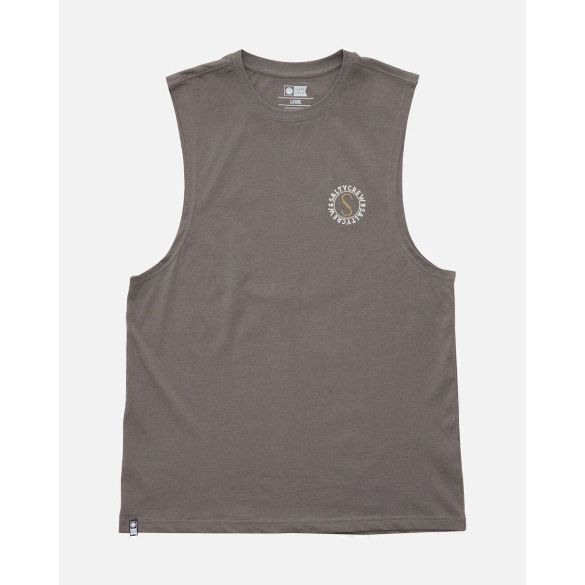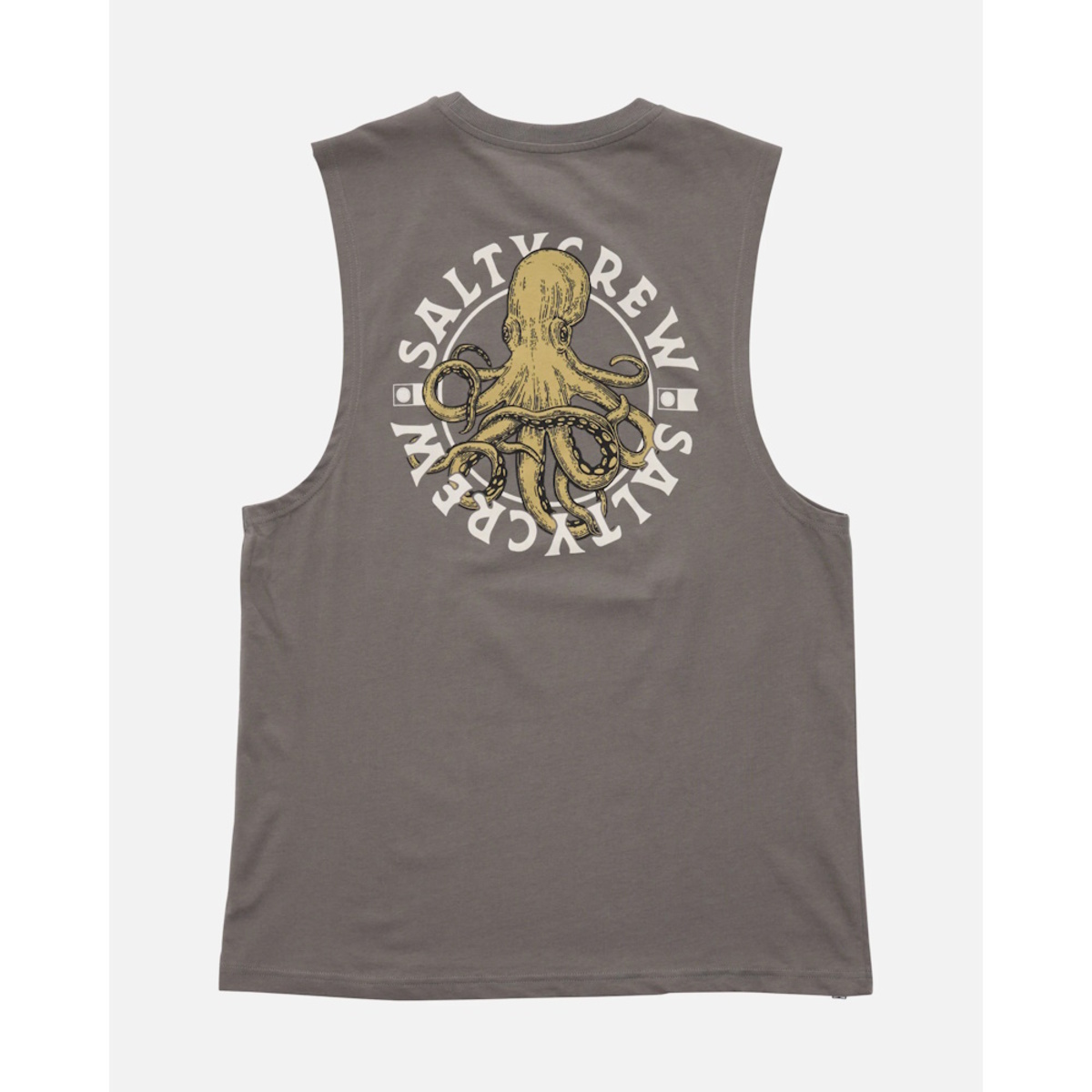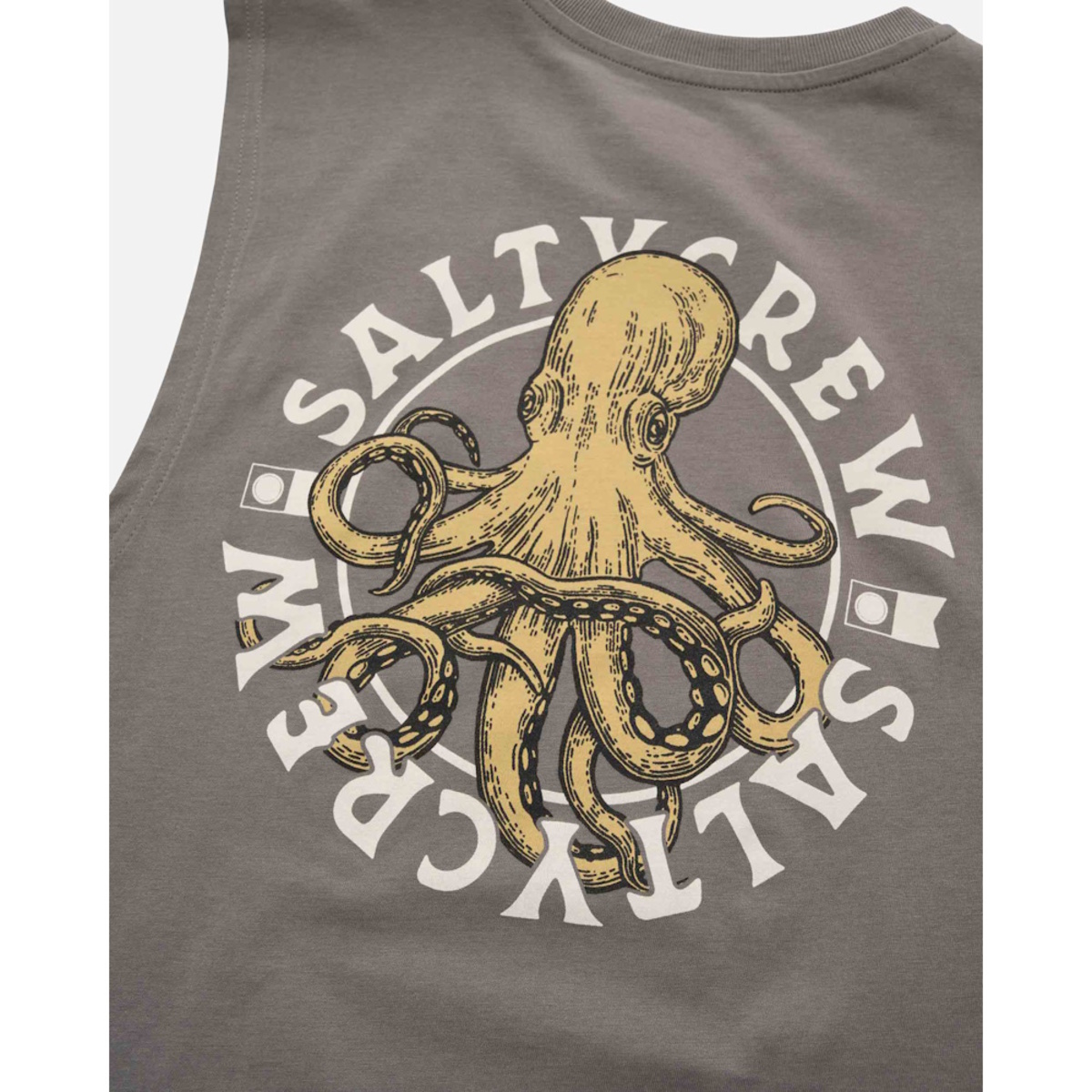 The Tentacles Muscle Tank in Charcoal is crafted from 160gsm ring-spun cotton jersey. It features a Salty Crew clamp label at the body hem and screen printed graphics on the front and back.