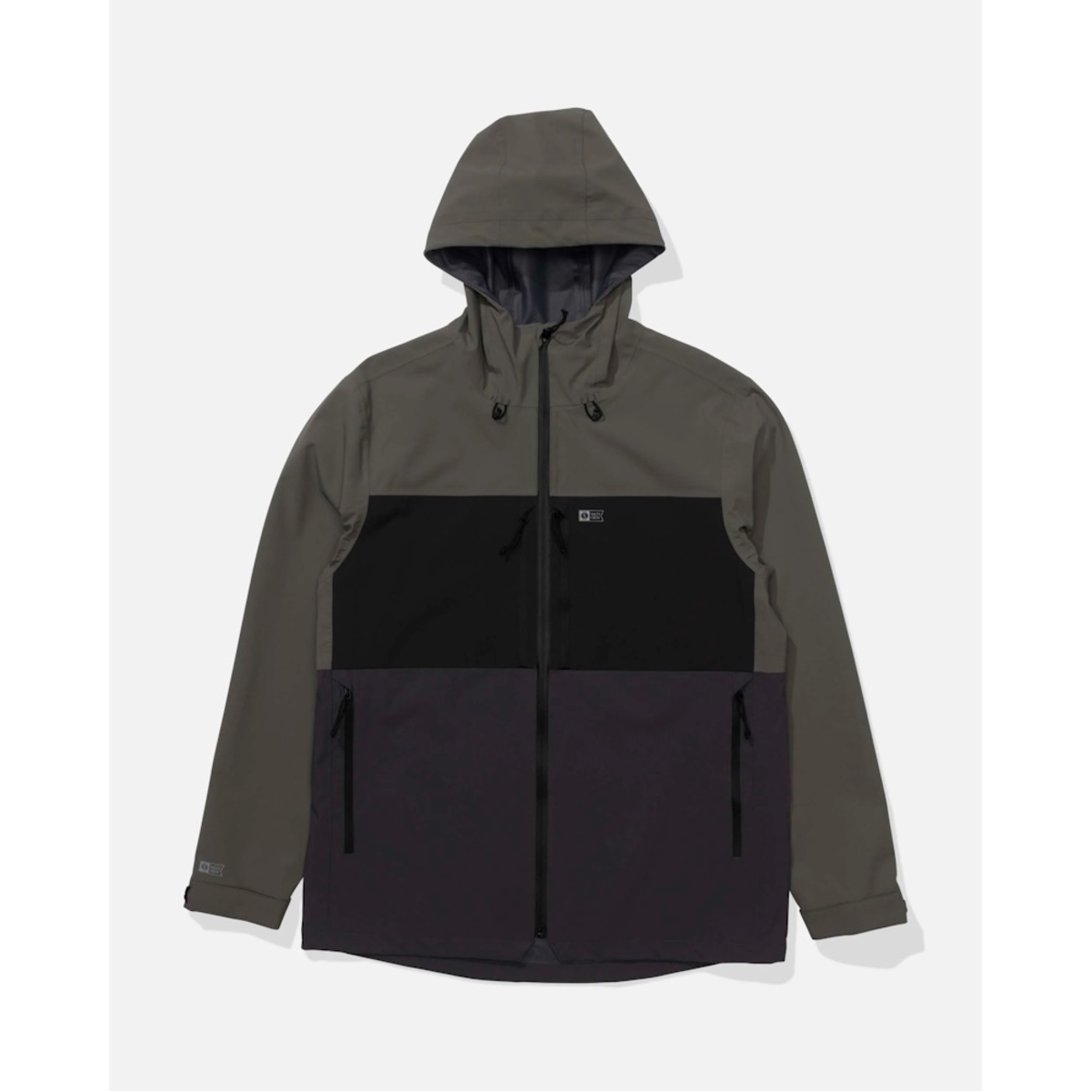 The jacket features a waterproof front zipper, zippered chest and side pockets, and a mock neck construction with an adjustable hood and sleeve cuffs. It also includes a kill switch d-ring at the bottom hem for added safety.