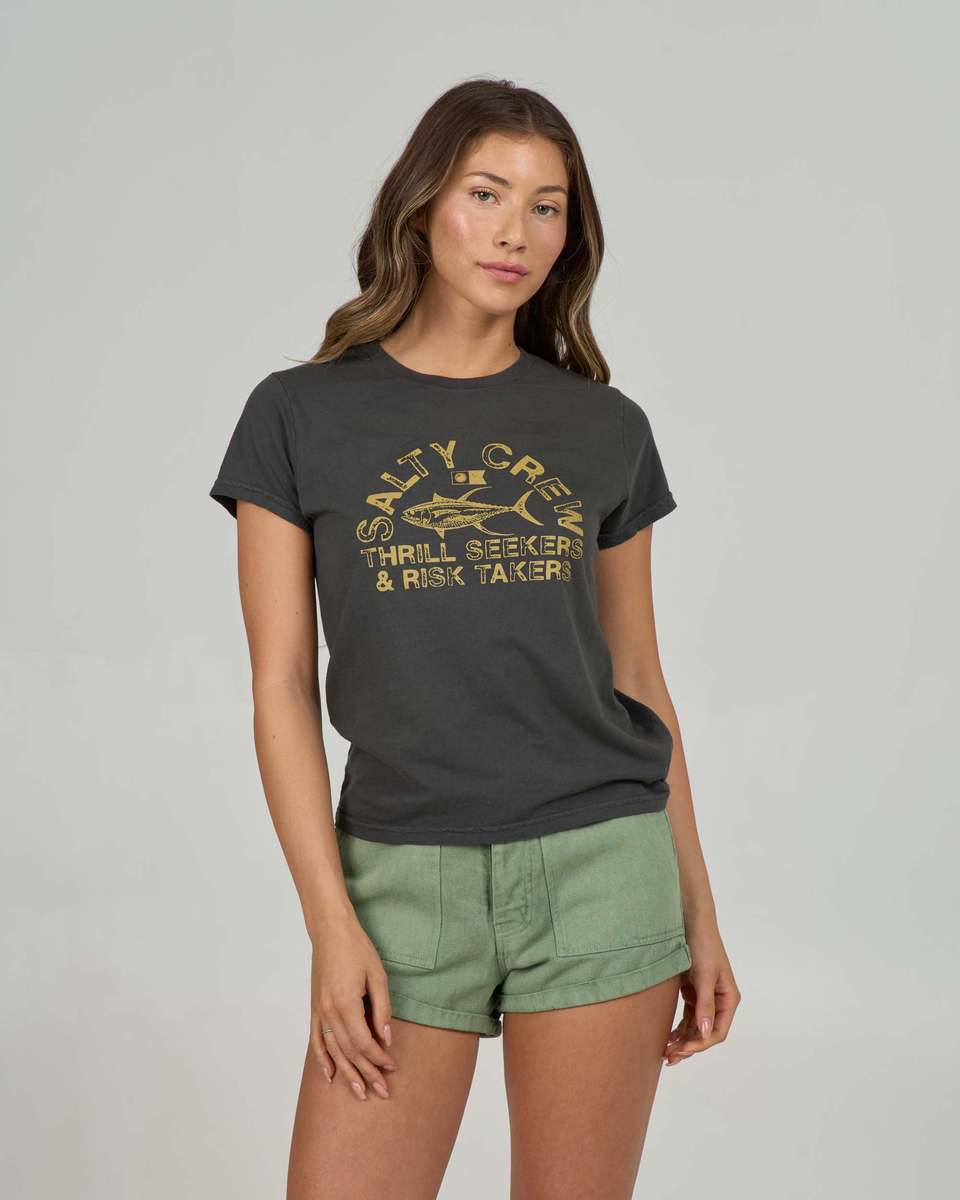 Stamped Modern Tee in Charcoal is made from a slightly fitted tee, capped sleeves and screen printed chest and back prints.