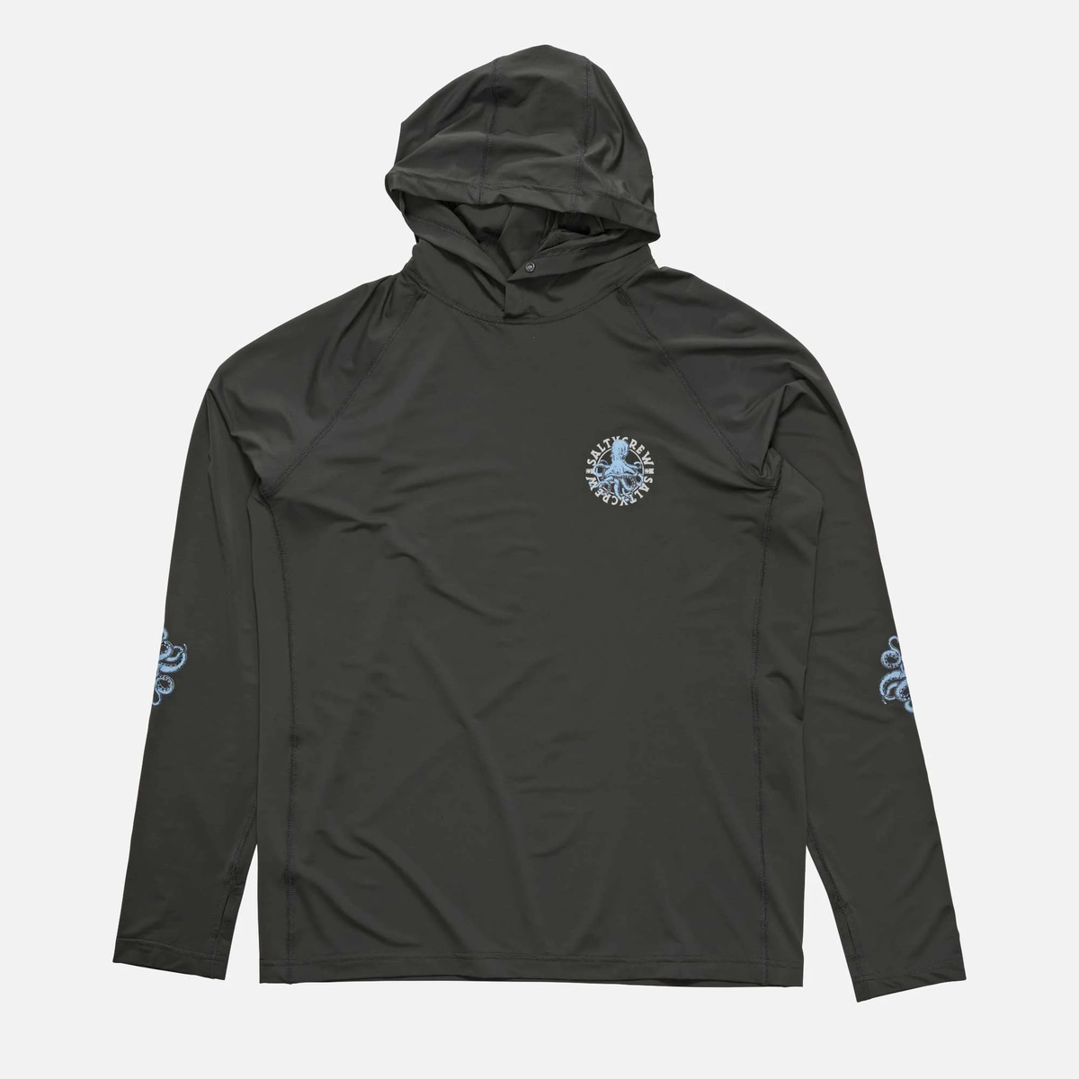 Tentacles Mask Sunshirt in Vintage Black is a longsleeve made from 90% Recycled Polyester/10% Elastane Perforated Jersey. Featuring three-piece hood, internal mask, moisture wicking properties, UPF50+ Protection, Anti-Microbial properties & flat lock seams with underarm gussets. Screen printed front, back & sleeve prints.