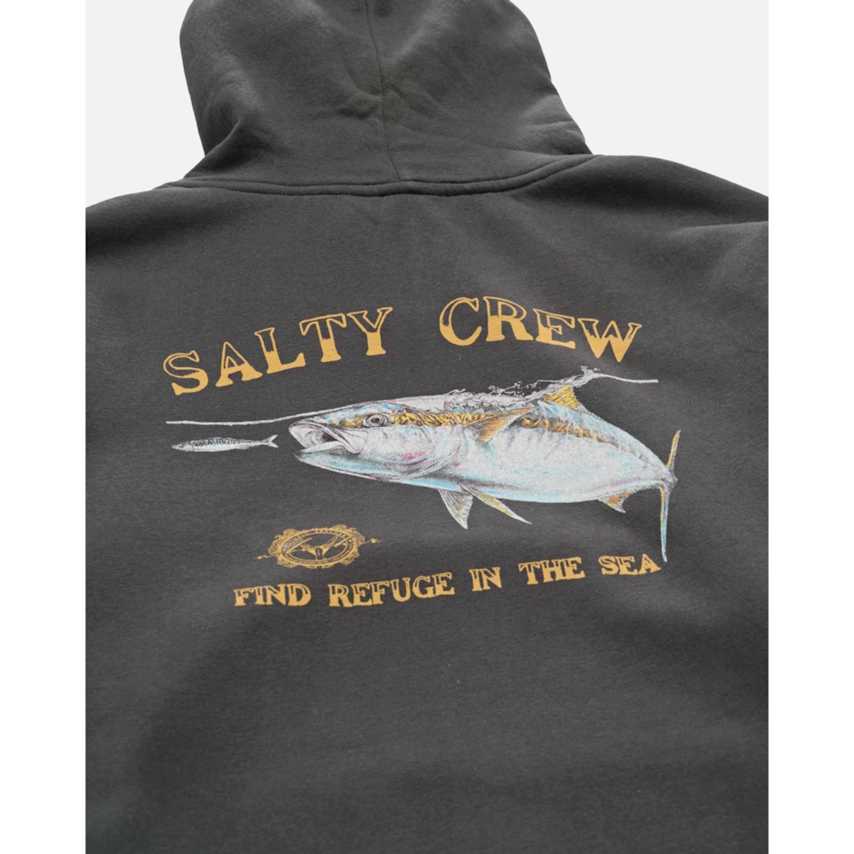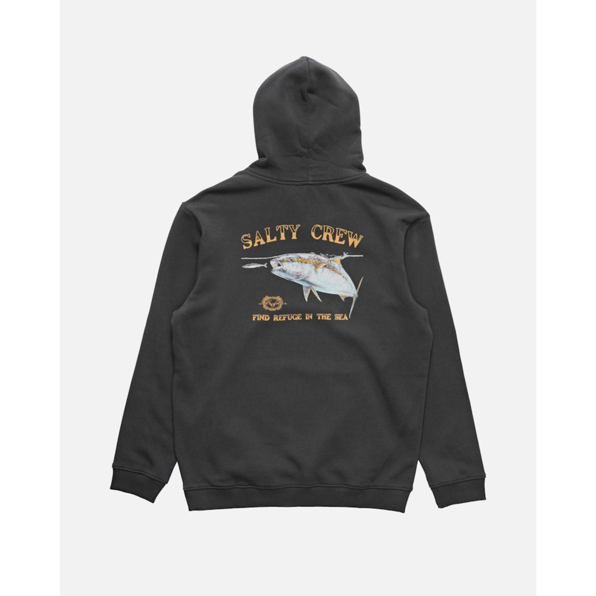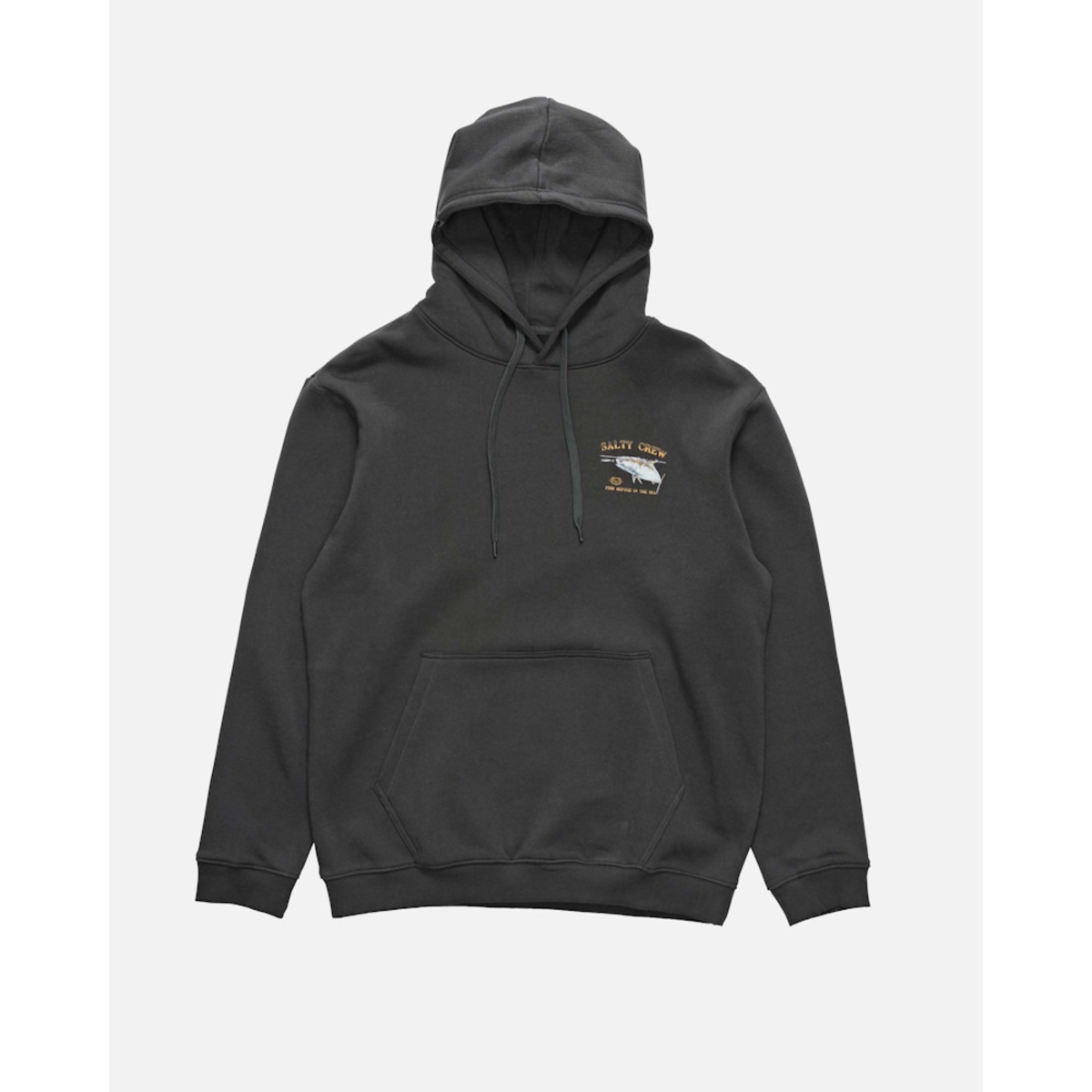 Surface Midweight Fleece Hood in Coal is made from our signature mid-weight Cotton/Polyester Brushed Fleece, 300gsm in weight. Featuring two-piece hood with encased drawcord, rib knit cuffs & hem, self-fabric kanga pocket & Salty Crew clamp label at hood opening. Screen Printed front and back prints.