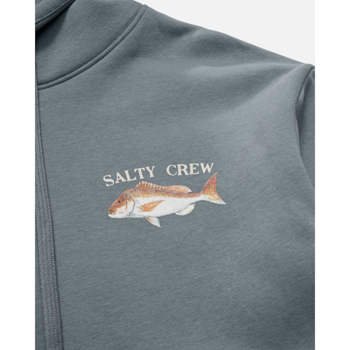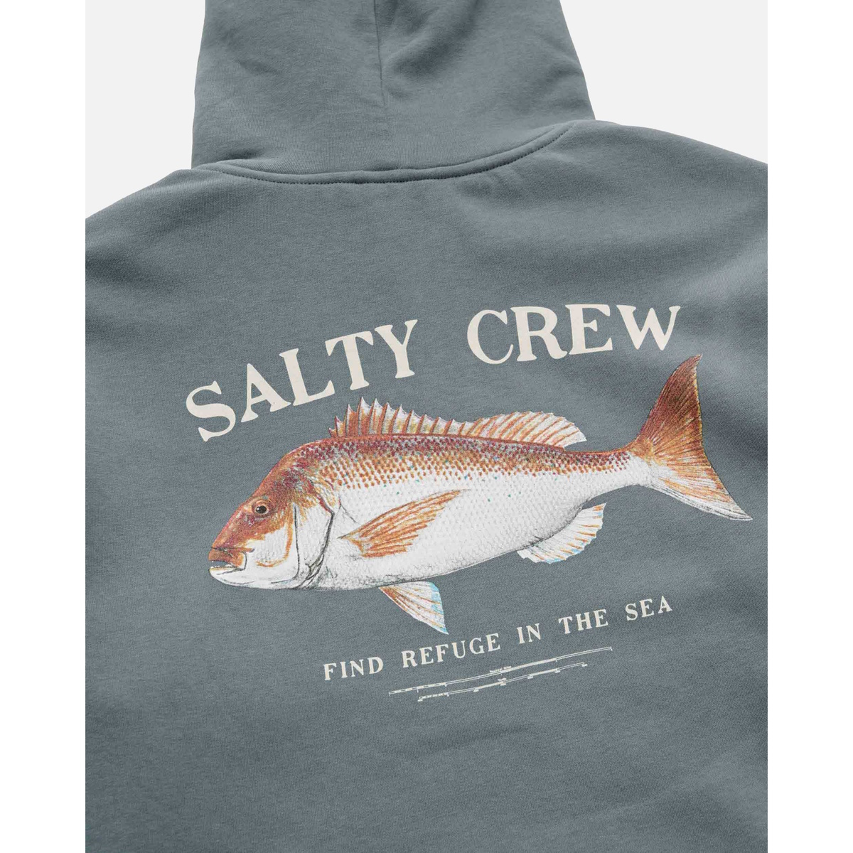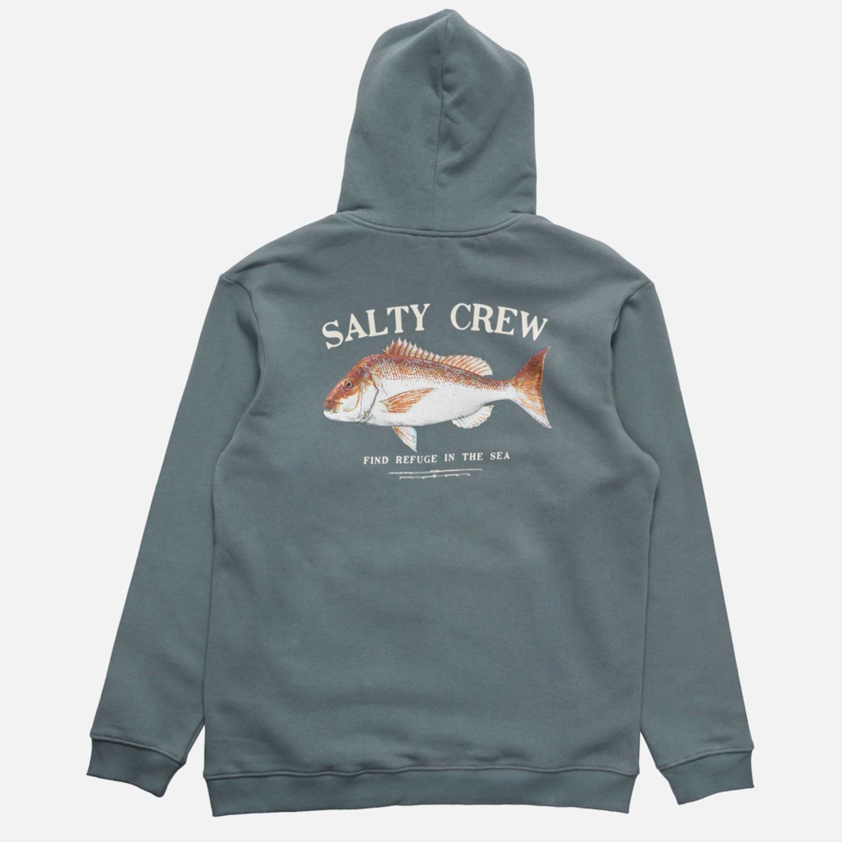Snapper Hood in Storm is made from our signature mid-weight Cotton/Polyester Brushed Fleece, 380gsm in weight. Featuring two-piece hood with encased drawcord, rib knit cuffs & hem, self-fabric kanga pocket & Salty Crew clamp label at hood opening. Digital Printed front and back prints.
