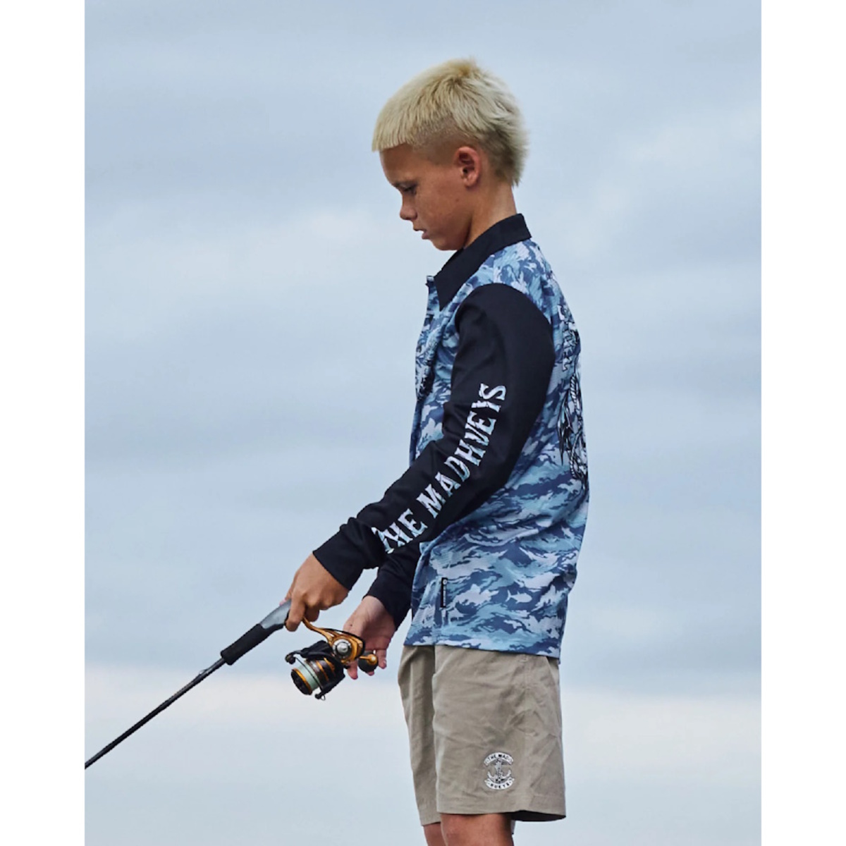 With a wicked rope skull anchor print, black sleeves, and a steel blue body, this jersey’s got serious attitude. Plus, the UPF 50+ sun protection means your little legend can stay out longer, fish harder, and look bloody good doin’ it.