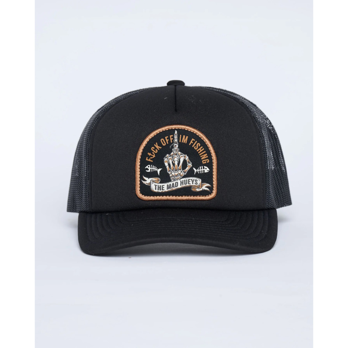 Keep the message clear and the vibe strong with the FK OFF FISH | FOAM TRUCKER in Black. Featuring the same bold “Fk Off, I’m Fishing” slogan, rude finger, fish skeletons, and hibiscus flowers as the tee, this black foam trucker is perfect for those who want to keep distractions off the water and good times rolling. Rugged, comfortable, and full of Hueys attitude—just how we like it.