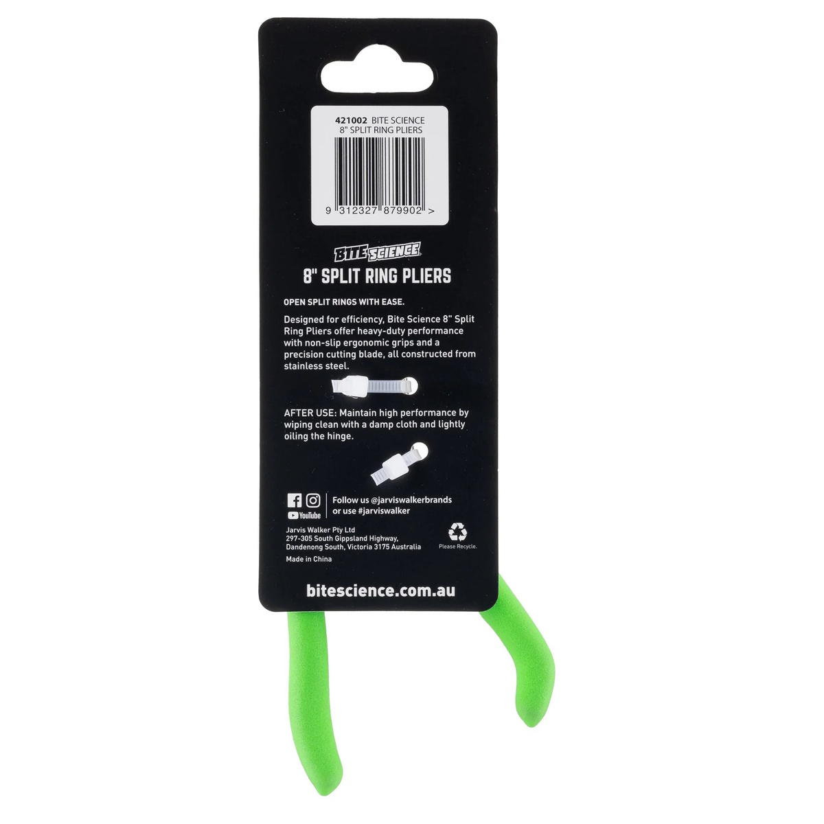 Designed for efficiency, Bite Science 8" Split Ring Pliers offer heavy-duty performance with non-slip ergonomic grips and a precision cutting blade, all constructed from stainless steel. Effortlessly open split rings with ease. Proper post-use care includes washing and lightly oiling the hinge for continued smooth operation.